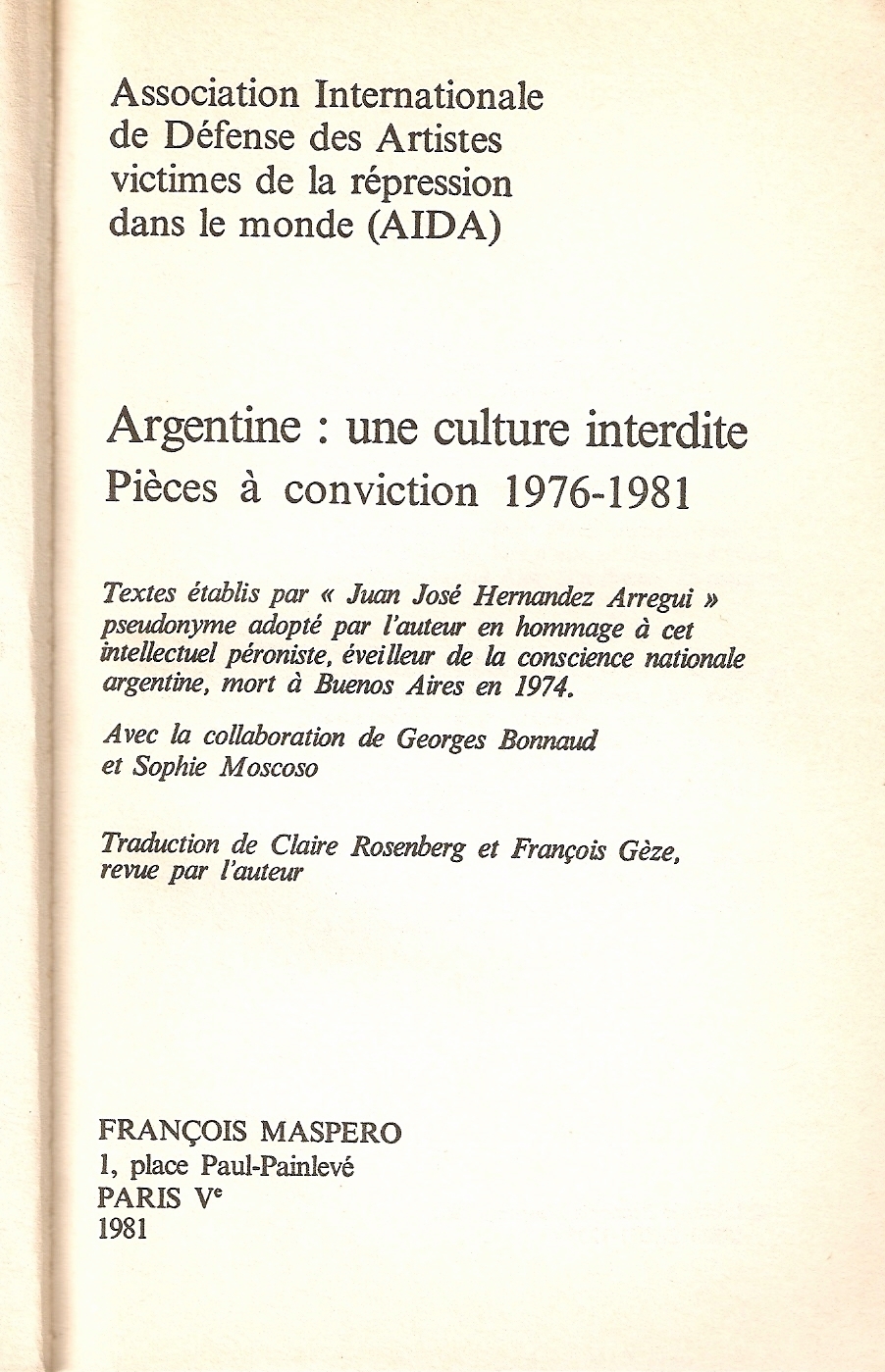 Año 1981 Argentine Une culture Interdite escrito por Envar sobre los artistas desaparecidos en su país |